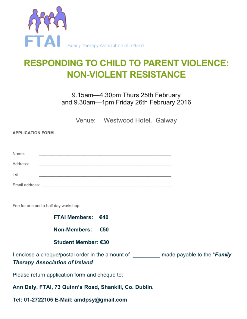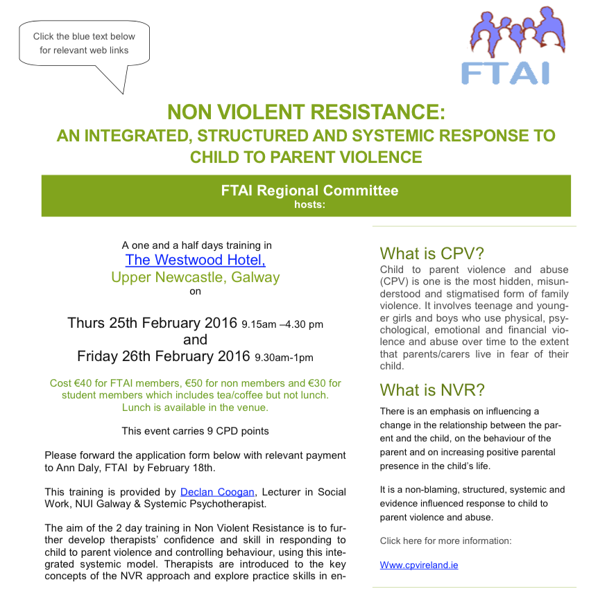 Register now for the Family Therapy Association of Ireland (FTAI) organised training on Child to Parent Violent and the Non-Violent Resistance programme.