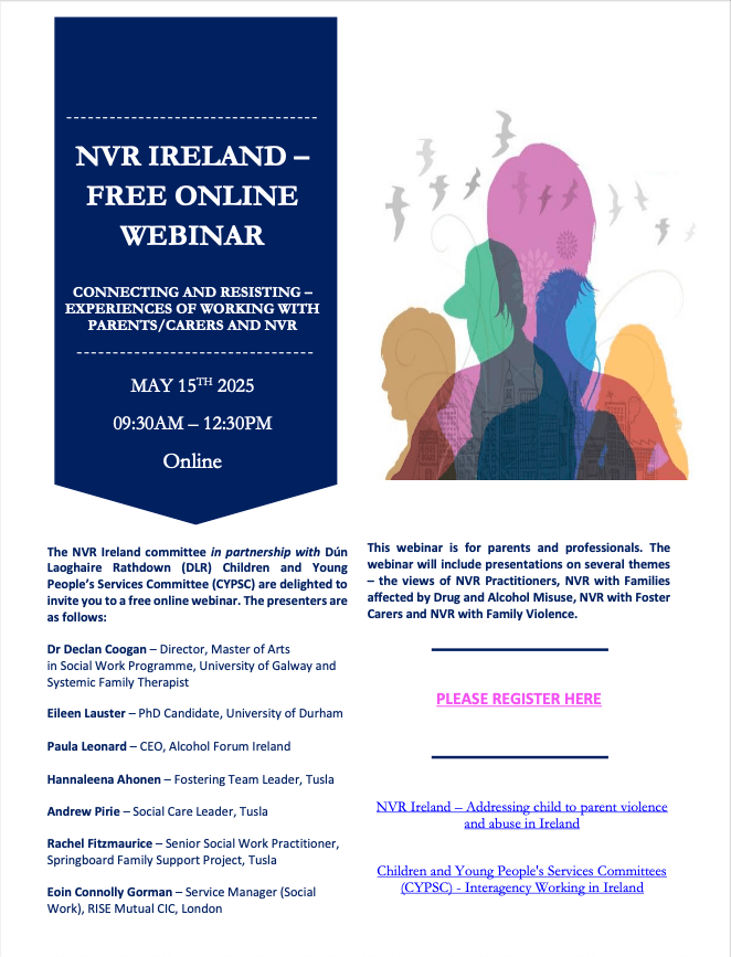 November 2025, two day accredited training in NVR, led by Dr. Tara Kelly and Madeleine Connolly, supports Practitioners, Supervisors, and Trainers in understanding and responding to Child to Parent Violence and Abuse (CPVA). Grounded in the Non Violent Resistance (NVR) model, the training equips participants to help parents and carers rebuild authority and manage complex family dynamics. Tara and Madeleine are highly experienced professionals in child and family work, with expertise in CPVA, family therapy, and child protection. Resources will be provided post to the Workshop. Spaces are limited—register by Friday, 7th November 2025 to secure your place. Certificate provided upon full attendance. See flyer for more information and to register interest.